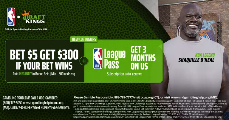 Use the DraftKings promo code to get $300 in bonus bets once your first bet wins, plus 3 months of NBA League Pass.