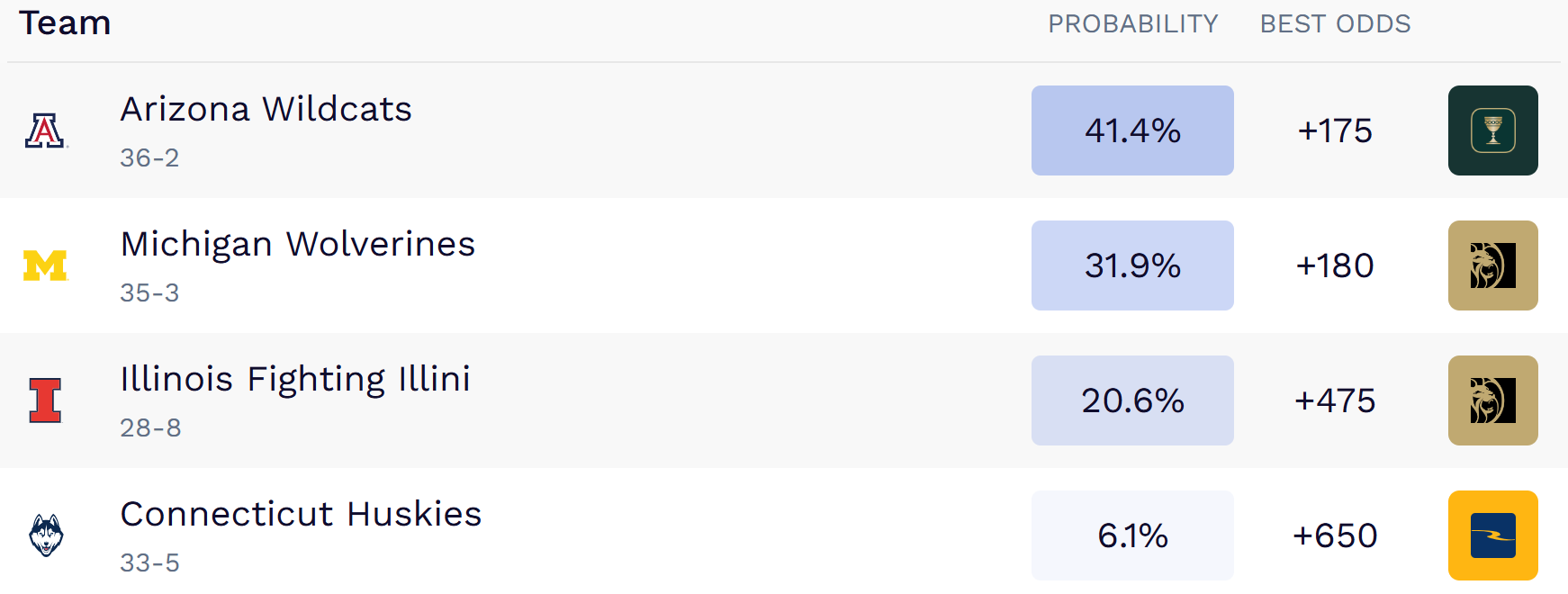 Arizona (41.4%, +175) enters as the tournament's new betting favorite after Duke's exit, with Michigan (31.9%, +180) nearly even with them in the market despite a lower model probability.