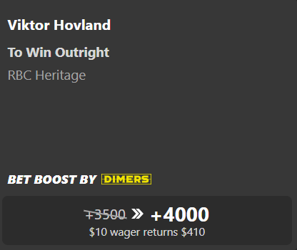 Victor Hovland's profile fits Harbour Town well, and these boosted odds makes him well worth a look this week, with a 2.4% Dimers win probability putting him right on the Top 10 bubble.