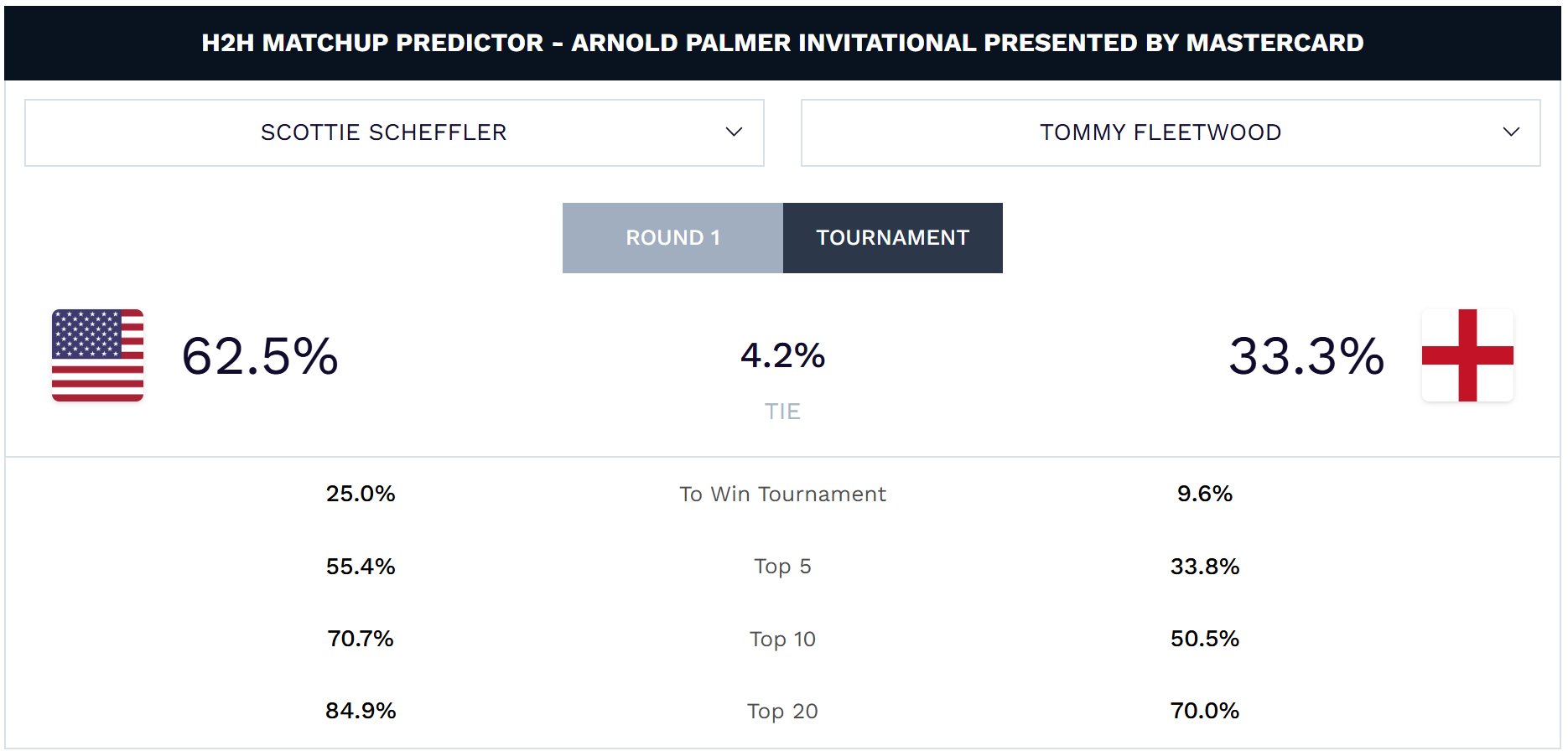 | 2. Tommy Fleetwood | 9.6% | 33.8% | 50.5% | 70.0% |