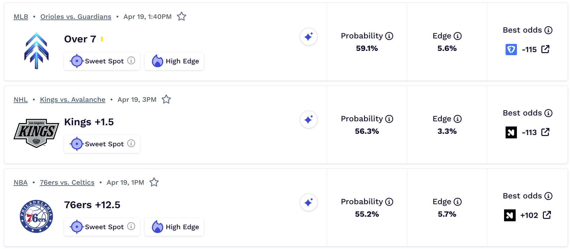 A full slate of MLB betting, NBA playoffs and NHL Stanley Cup playoff action all take place on Sunday, April 19 and using Dimers' best bets tagged with our "Sweet Spot" signal, we've found the most profitable pick to make in each league.