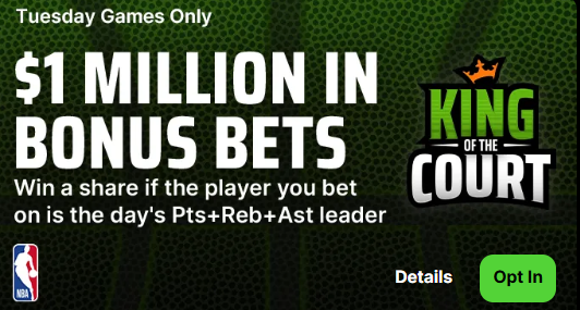 DraftKings' fan-favorite King of the Court promotion returns for NBA player prop betting on Tuesday, November 4 with a bonus bet pool of $1 Million up for grabs if you can pick the night's PRA leader.