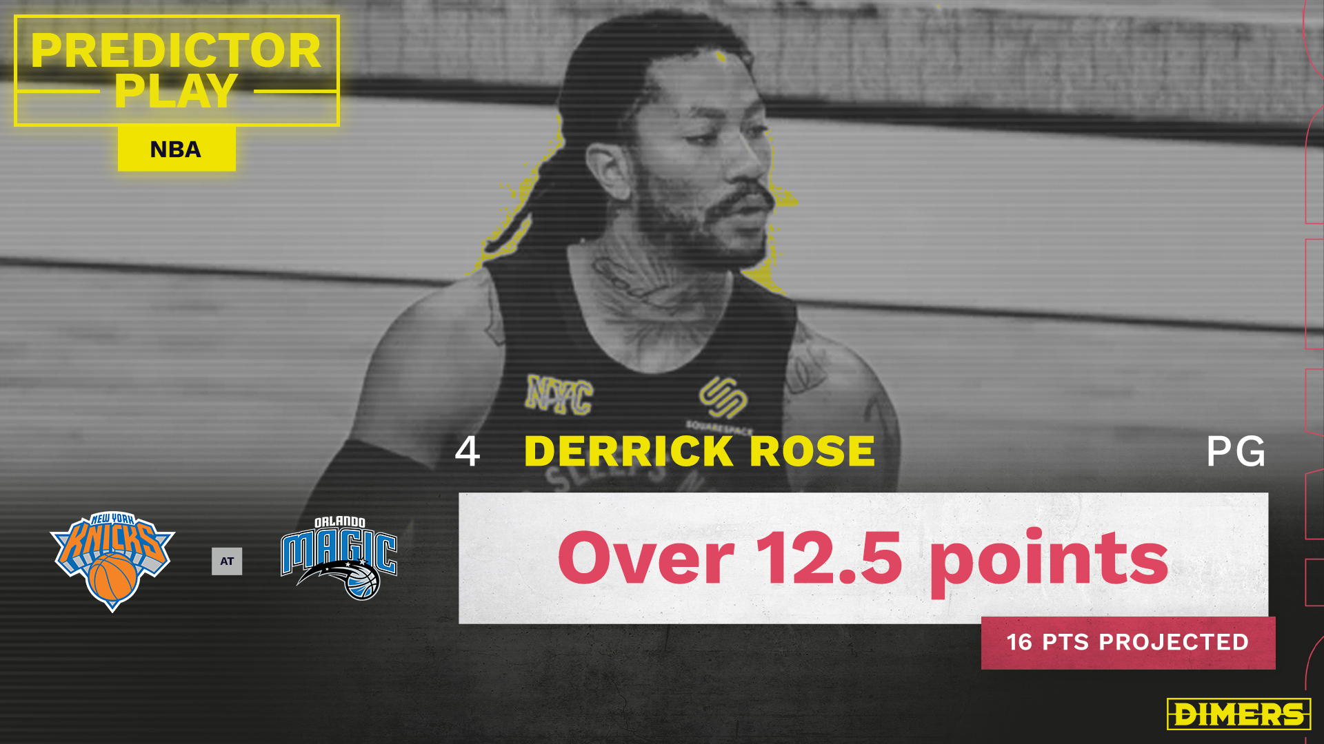 Our model's first play of the night comes from the first game on the slate, with Derrick Rose projected to go well above his points total as the Knicks face the Magic. Rose put up just 8 points last time out, but in his other three games since moving back to NY he put up 14, 14 and 16 points.
