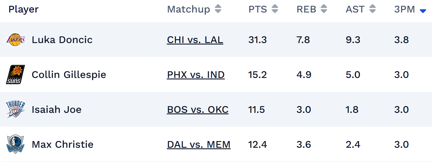 Luka is the top-projected three-point shooter on the entire slate at 3.8 per the Dimers model, and the matchup couldn't be much better.