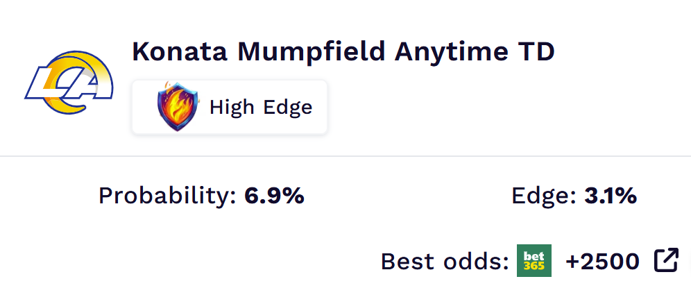 Mumpfield may have just a 6.9% probability to find the end zone on Sunday, but the sportsbooks say he has just a 3.9% probability, and that's the definition of opportunity.