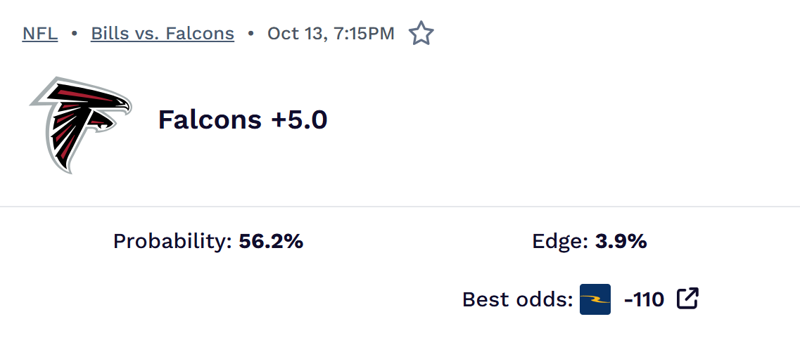 Dimers’ top-rated play of the week is the Falcons +5 against the Bills, showing a 56.2% probability and a 3.2% edge. Buffalo enters off a frustrating loss to the Patriots, meanwhile, Atlanta has had two full weeks to prepare and gets a matchup that favors their strengths.