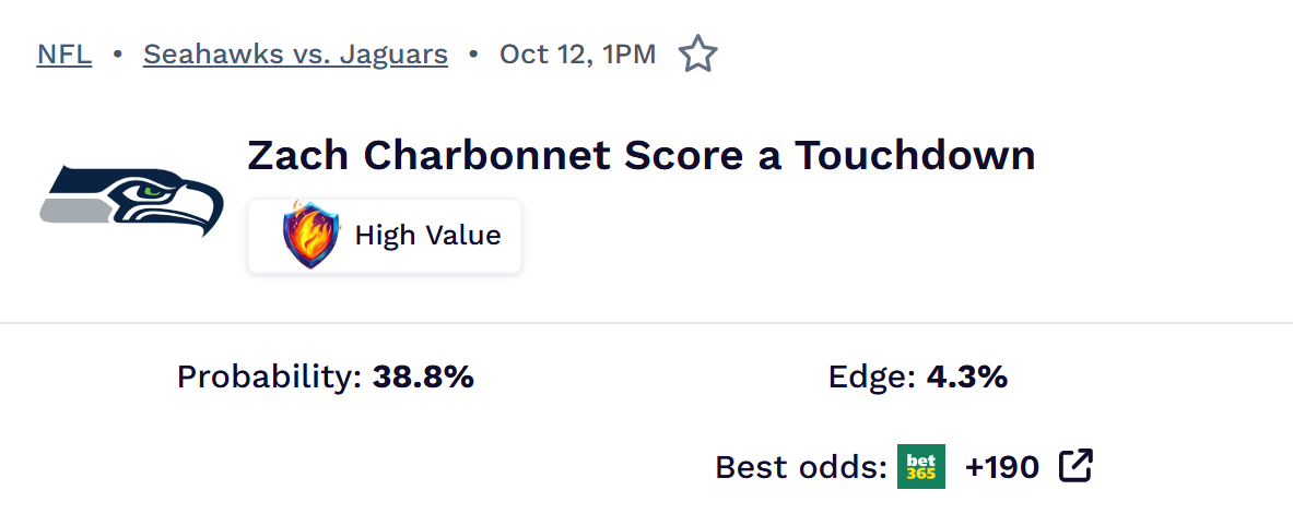 His scoring probability is nearly identical to Walker’s 42.3%, yet Walker’s TD line is listed at -115 on the same book—creating a clear +EV opportunity on Charbonnet.