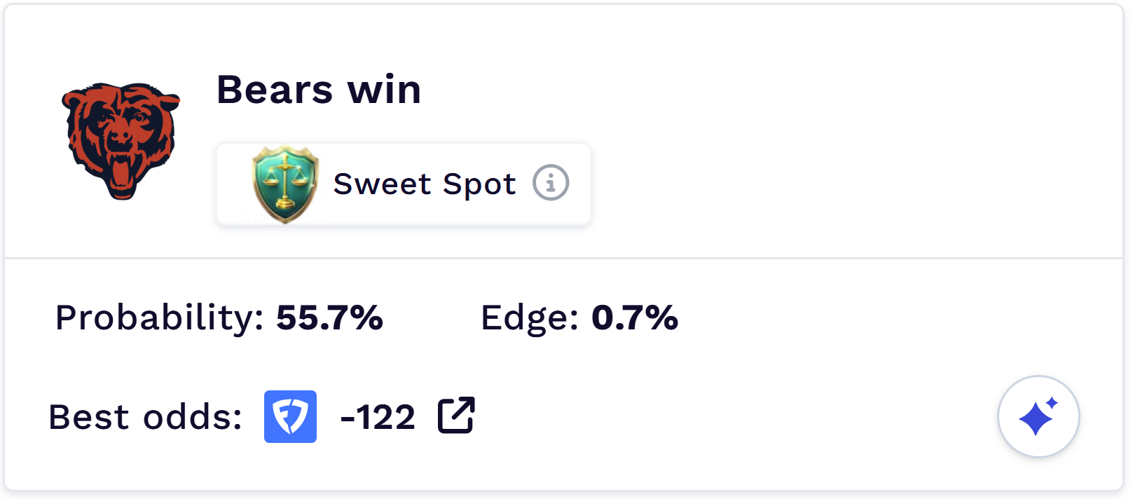 The Dimers model doesn't give them a big edge, getting just about fair odds at -125 on DraftKings, but this play lands in the Sweet Spot, with NFL moneylines at a low edge returning a 14.2% ROI over 42 bets this season.