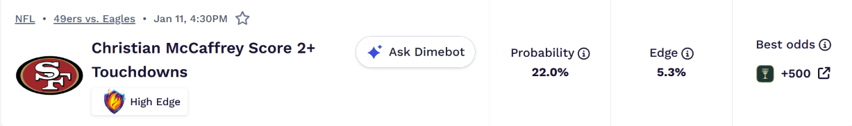 | Christian McCaffrey (49ers) | 58.2% | -135 | 22.0% | +500 |