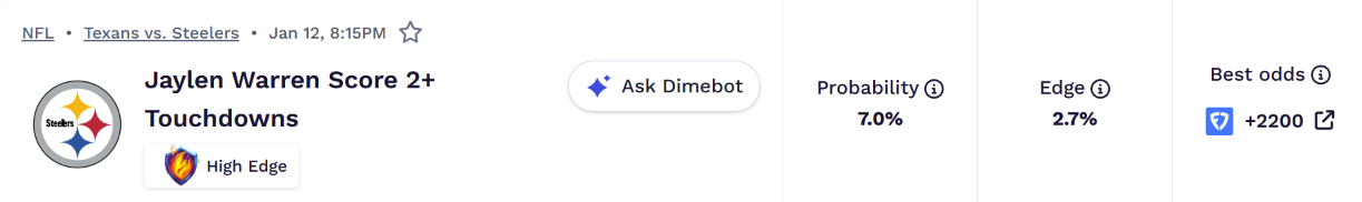 Warren gets a 34.7% Anytime TD probability from the Dimers model, tied for the highest on the Steelers, and implying fair odds of +190, while he's at +235 on DraftKings. His 7.0% probability for 2+ touchdowns suggests a fair price of +1330, giving a big edge at his best odds of +2200.