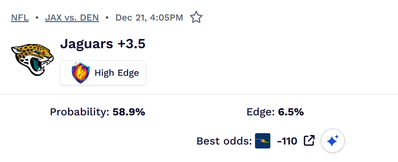 Jaguars +3.5 at Denver is one of the more intriguing plays on the board, checking in at a 58.9% probability with a 6.5% edge, moving by a half-point in our favor since featuring this bet on the Dimers Sports Betting Podcast.