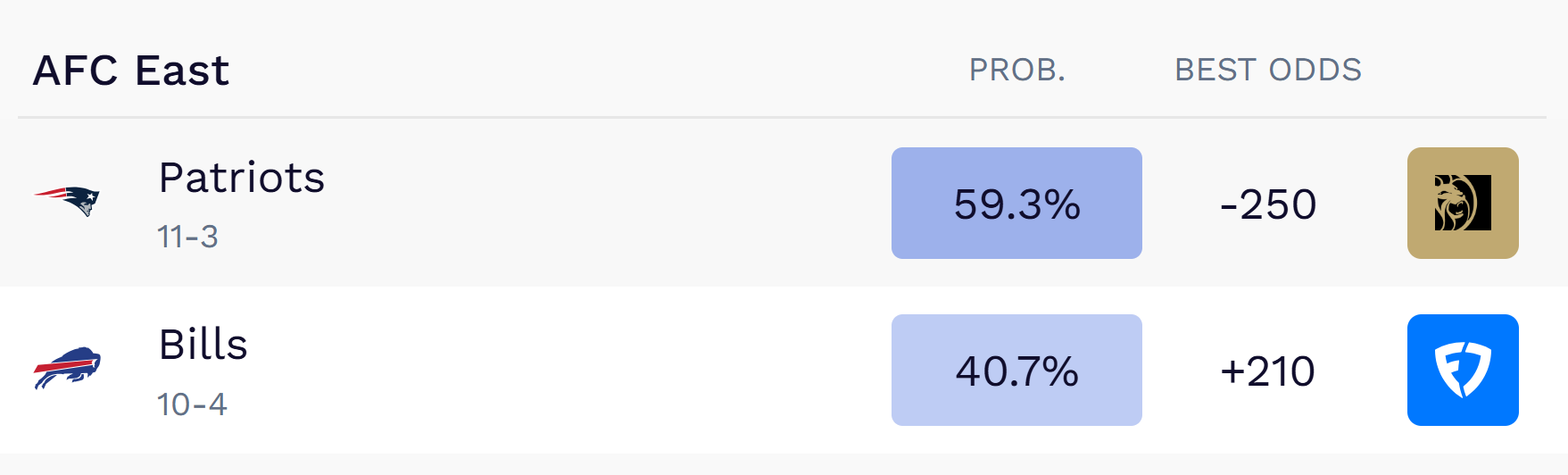As far as value to win the division, that lies on the Bills whose 40.7% probability makes fair odds of +145, yet they are available at +210. If the Bills win (85% probability) and the Patriots lose (58% probability), they would be tied, making Buffalo to win the AFC East worth a look.