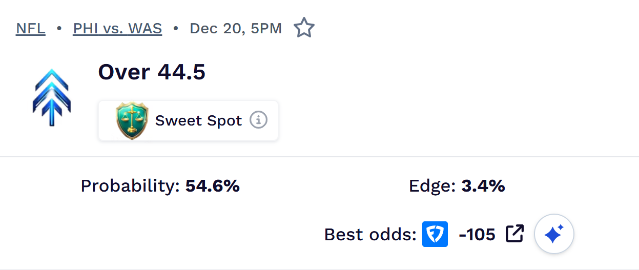 Totals haven’t been a major focus in this article this season, but Eagles–Commanders Over 44.5 stands out as it draws our brand-new Dimers Sweet Spot signal.