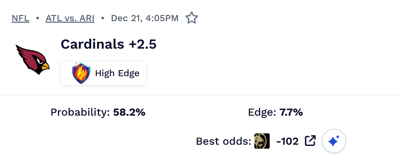 Cardinals +2.5 was an early-week value play and continues to hold strong, carrying a 58.2% probability and a 7.7% edge in the Dimers model.