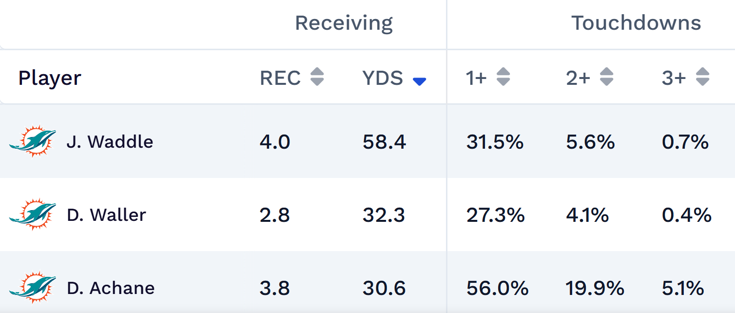 RB De’Von Achane remains the clear engine of the offense, projecting for over 110 total yards and carrying the highest touchdown probability on the roster at 56.0%.