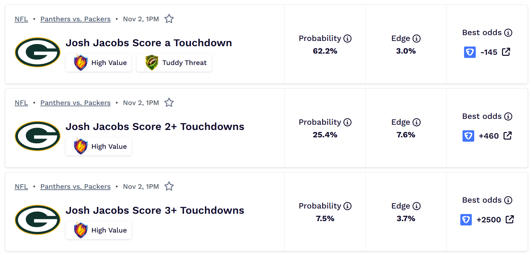 Josh Jacobs stands alone as the week’s premier touchdown ladder candidate, with a 62.2% chance to score once, 25.4% for two, and 7.5% for three touchdowns, all marked as high-value edges.