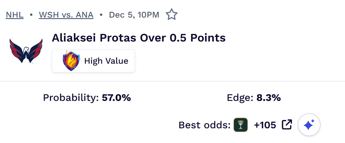 In the games he didn't pick up a point, the Capitals lost to the Lightning and played their closest game of that stretch vs. the Jets. At a 56.7% win probability tonight, everything lines up for Protas to keep his streak going against the Ducks who will send Ville Husso and his 3.45 GAA into the net.