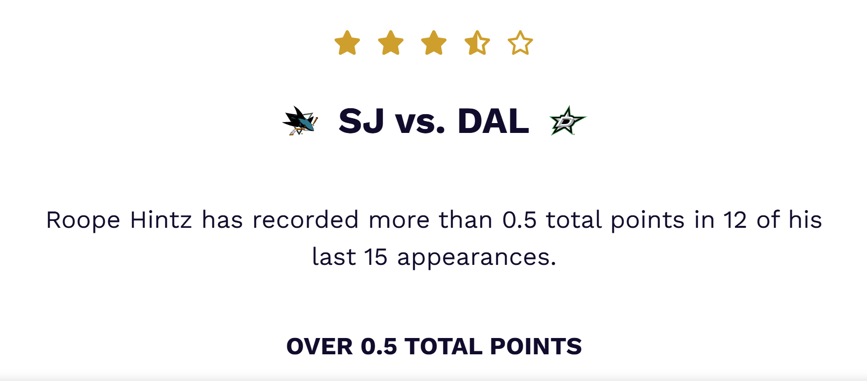 | Roope Hintz (Stars) | To record 1+ point | 12 of last 15 | -180 |