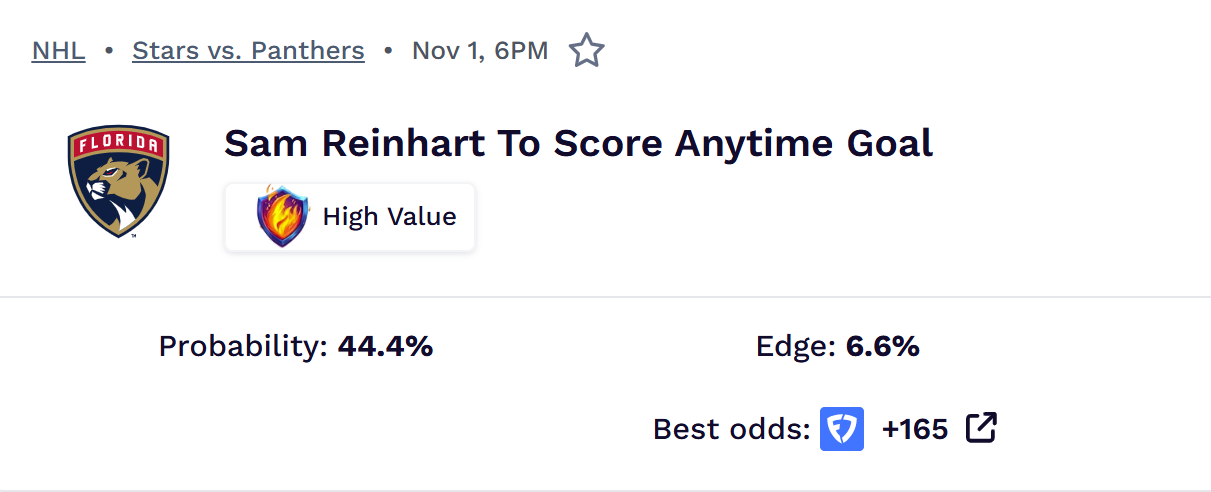 Listed at +165 with a 44.4% probability, Reinhart was one of the top edges on the entire Dimers NHL slate, boasting a 6.6% edge and fair odds closer to +125.