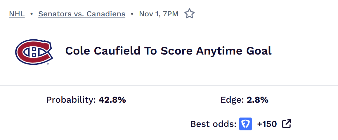 At +150 with a 42.8% Dimers probability and a 2.8% edge (fair odds of +130), Caufield represented strong betting value!
