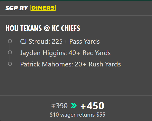 NFL parlay for Chiefs vs. Texans at +450 odds (boosted from +390)