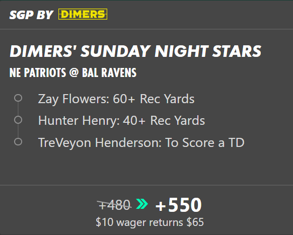To close out NFL Sunday, we're using our model's Ravens-Patriots Sunday Night Football predictions to build a +480 Parlay (SGP) boosted to +550 over on bet365, where new users can also claim a $200 bonus using the bet365 bonus code DIMERS.