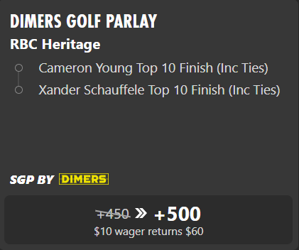 We've combined the Dimers data and a boost from bet365 to build a Top 10 finish golf parlay at this week's RBC Heritage tournament.