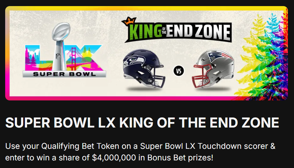 Super Bowl 60 "King of the End Zone" DraftKings promo upgraded to $4 Million for Seahawks vs. Patriots