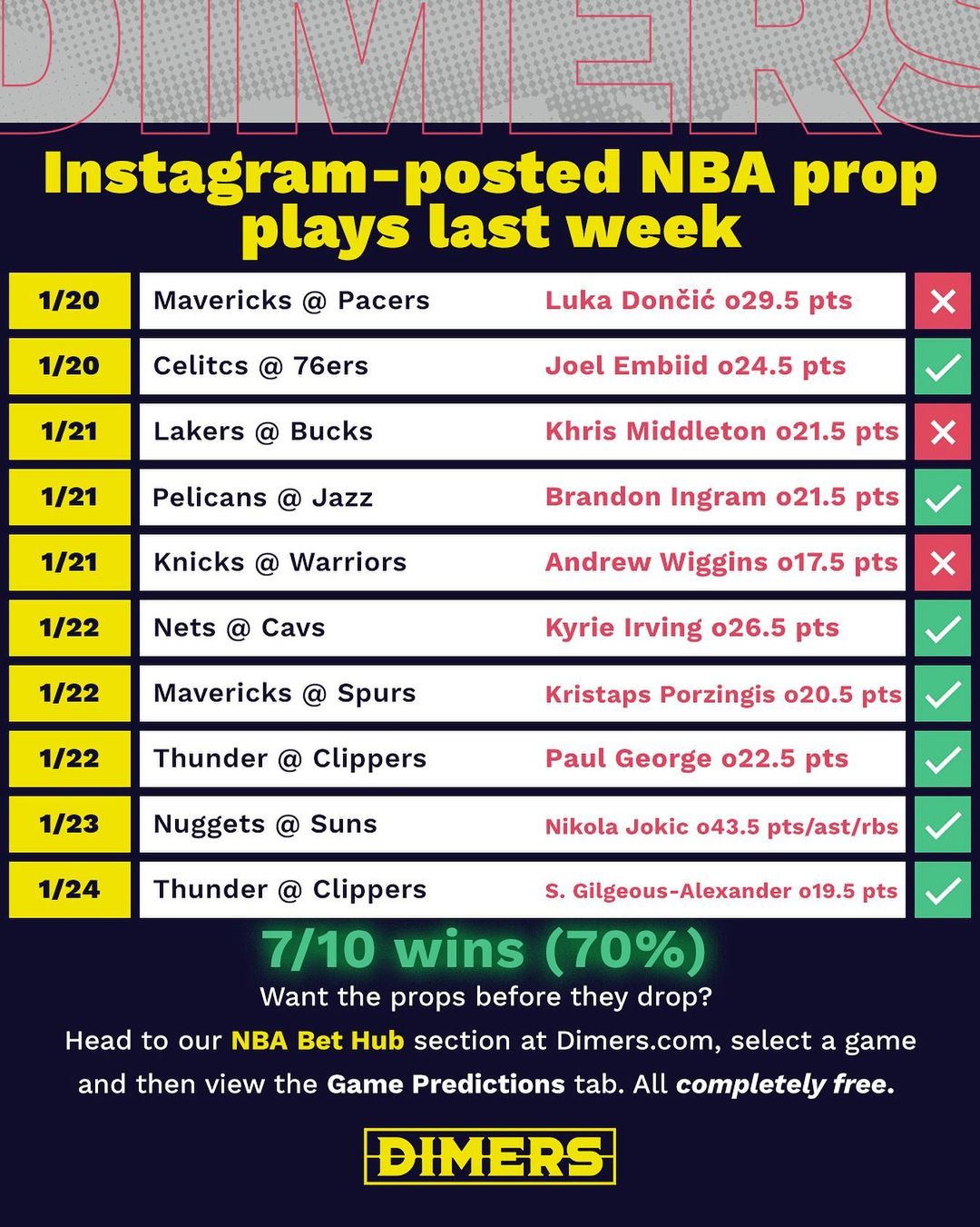 Our NBA predictor plays over at the Dimers Instagram were almost too hot to handle, with a ridiculous win rate of 70% last week!