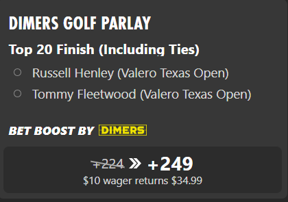 We've combined the Dimers data and a boost from bet365 to build a Top 20 finish golf parlay at the Valero Texas Open this weekend.