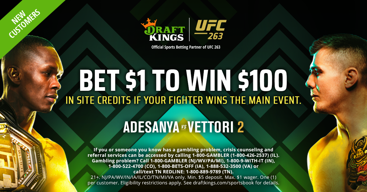 DraftKings Sportsbook are the official sports betting partner of UFC 263 and they have a great offer for new customers, where we can simply bet $1 to win $100, if we pick the winner correctly!