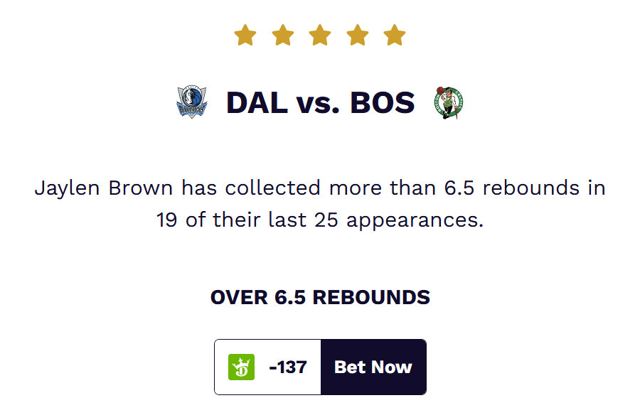 If one fairly assumes Tatum will avoid taking hard drives to the basket in his first game back, targeting his assists prop could offer value. With 4+ assists available at +150 odds on DraftKings, our model identifies a notable NBA prop opportunity.