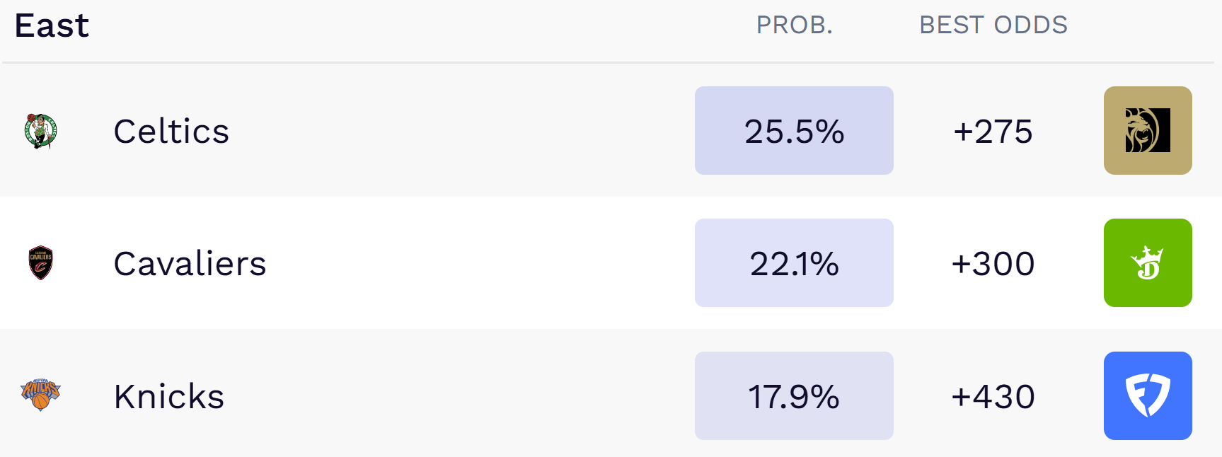 At +900, they represent the fourth-most likely team in the NBA to win the championship, and the top overall probability in the East.