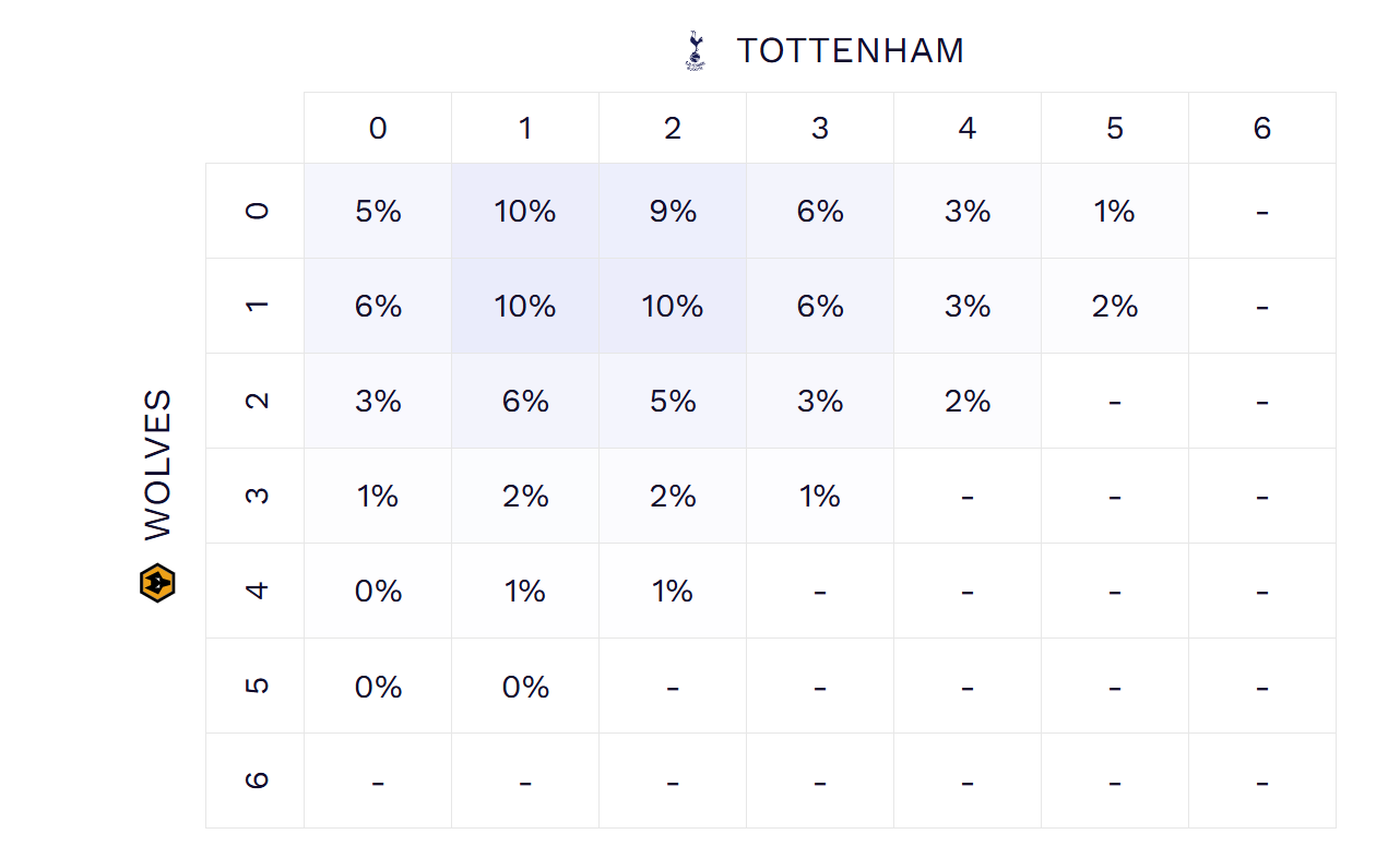 However, there are several other scores with a higher probability, including three that are twice as likely to occur as the 0-0 draw: a 1-0 Spurs win, the 1-1 draw, and a 2-1 Spurs win, each projected at a10% probability.