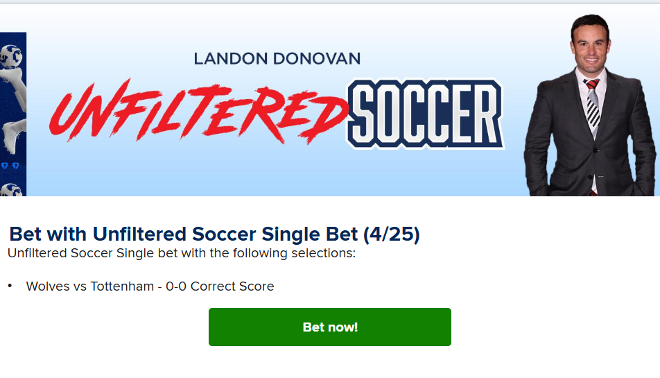 FanDuel's latest promotion features former USMNT star Landon Donovan's featured pick of a 0-0 correct score in the Wolves vs. Tottenham match on Saturday, April 25.