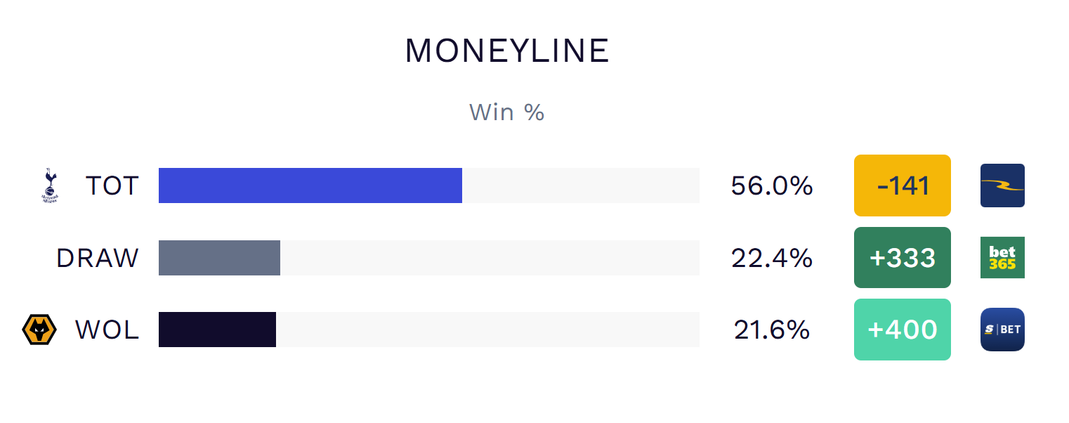 First off, Dimers gives Tottenham a 56% chance to win, Wolves a 21.6% upset probability, with a 22.4% chance of a draw. The over/under sits at 2.5 goals, with a 57% chance to go over. Spurs desperately need a win to stave off relegation, while Wolves who have already been officially relegated, enter the fixture stripped of any motivation.